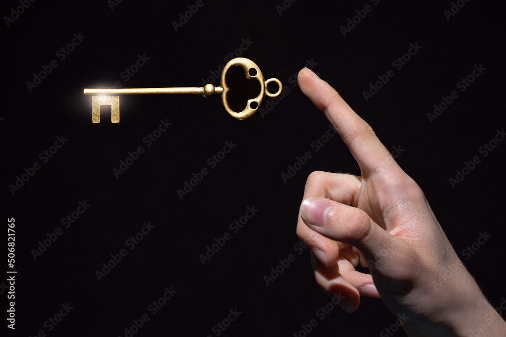 a man's hand and a golden key on a black background, the index finger shows the key to success