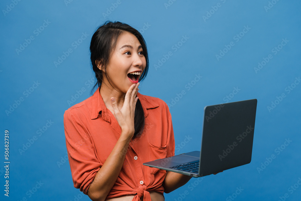 Young Asia lady using laptop with positive expression, smiles broadly, dressed in casual clothing feeling happiness and stand isolated on blue background. Happy adorable glad woman rejoices success.