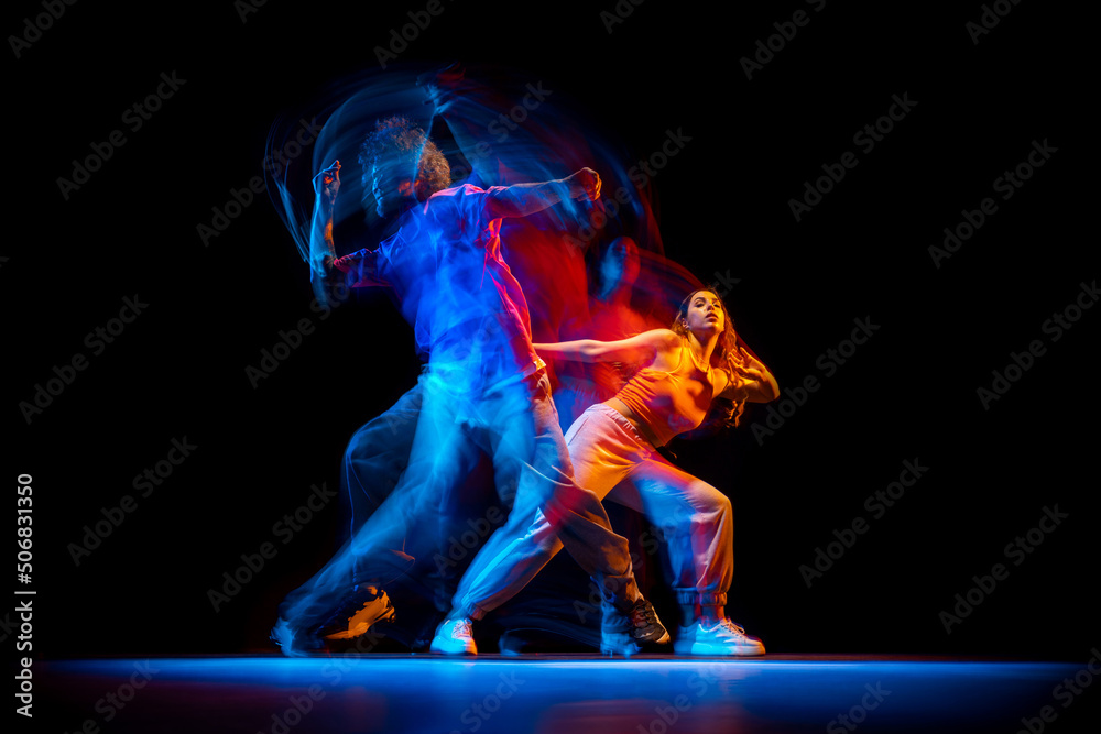 Young man and woman dancing hip-hop in sportive style clothes on dark background at dance hall in mixed neon light. Youth culture, hip-hop, movement