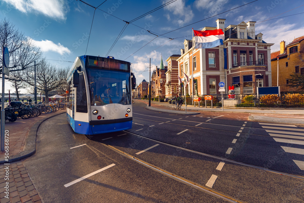Amsterdam tram, dutch flag against background of typical Dutch houses, Holland, Netherlands.