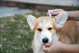 Close up woman applying tick and flea prevention treatment and medicine to her dog or pet