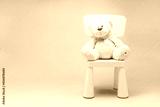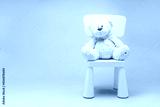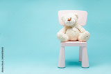 Toy bear sit on small pink chair for kids isolated on blue background.