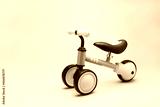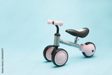 Baby Balance Bike Isolated on blue background. Modern Kids Three Wheels Tricycle Bicycle Side View.