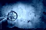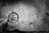 a man looks at an old map through a magnifying glass, the concept of travel and treasure hunting