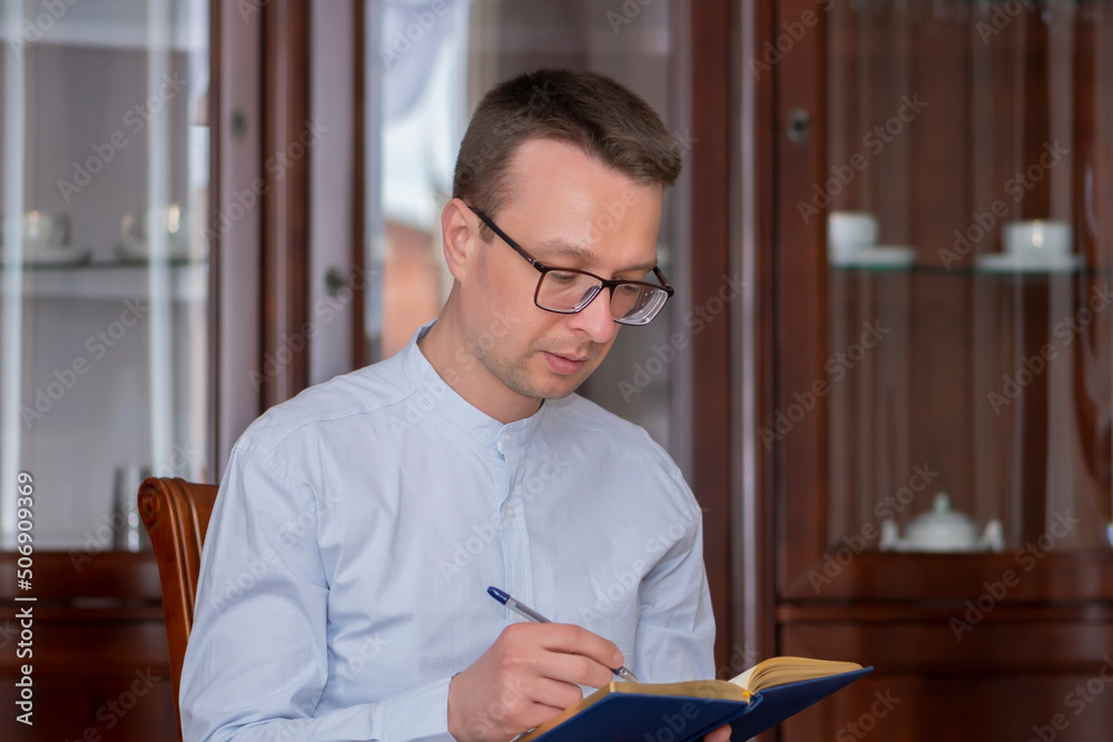 A middle-aged man with glasses reads a diary on a blurred background in the apartment.