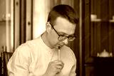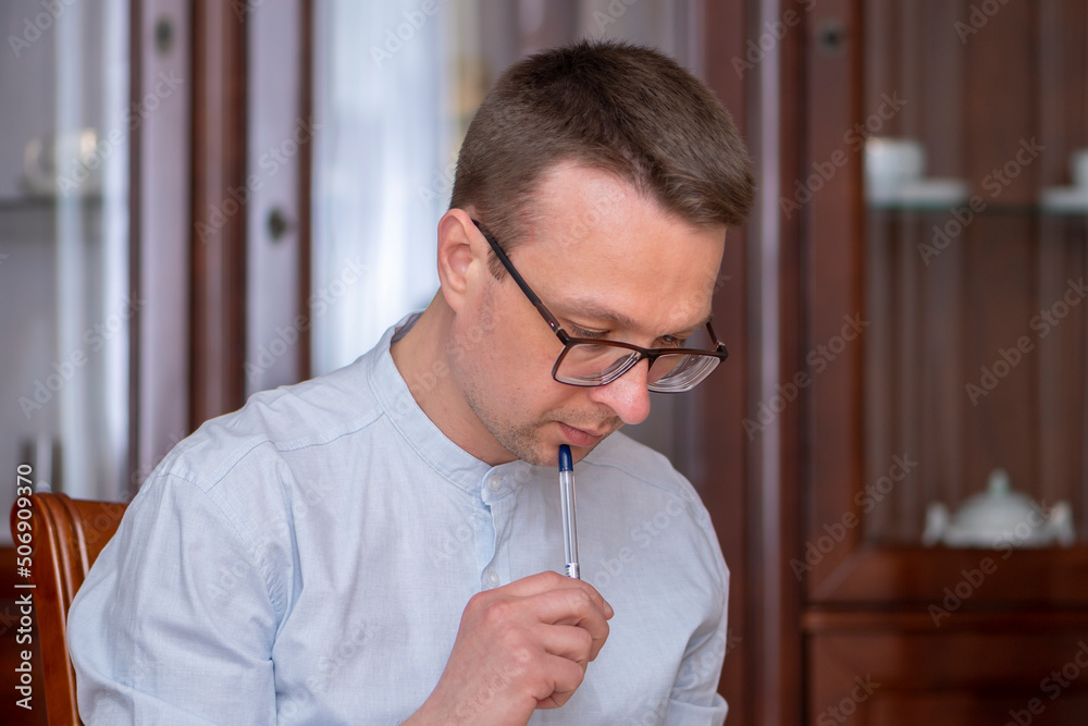 A middle-aged man with glasses reads a diary on a blurred background in the apartment.