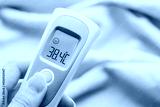 female hand holding ir thermometer with high temperature. close up. copy space. Infrared temperature measuring device. Healthcare home action. Non-contact thermometer