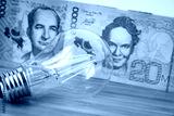 Costa Rican money and light bulb, Concept of rising energy and electricity prices in Costa Rica