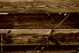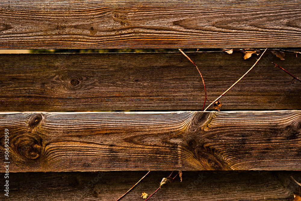 Płot z desek ze starego drewna z wyraźnie widocznymi słojami i porośniętego porostami .