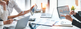 Business advisor, business people talking, planning analyze investment and marketing on tablet in office.