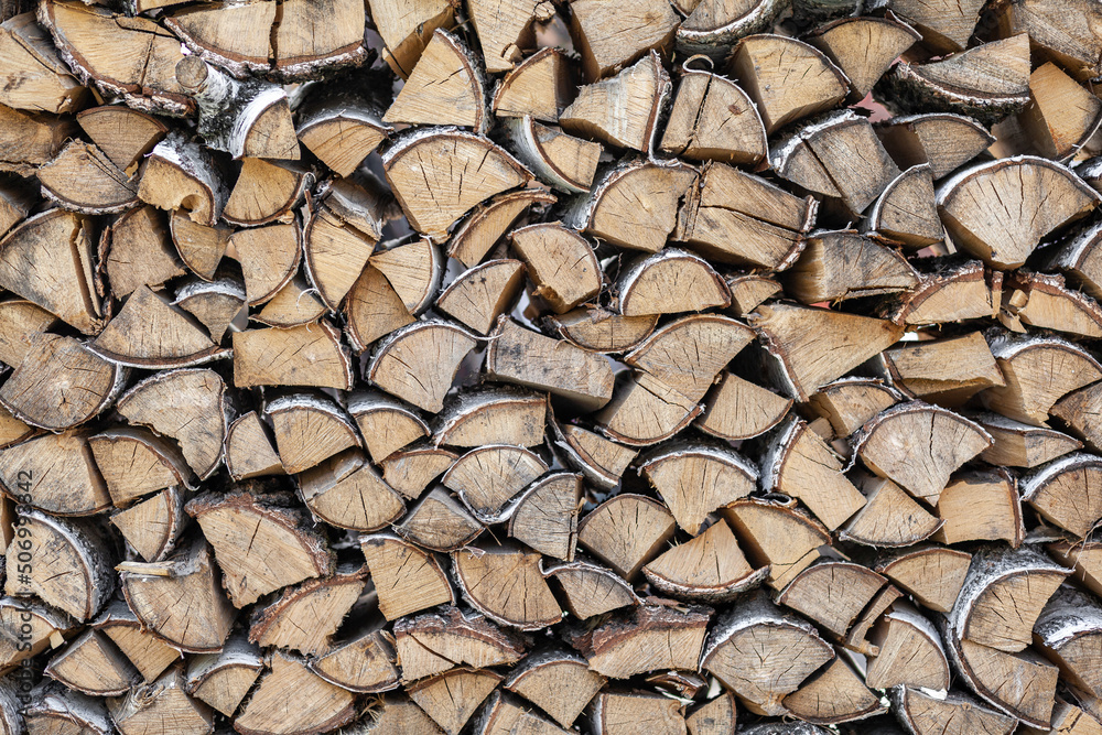 firewood background of chopped wood for kindling and heating the house Close-up. a woodpile with stacked firewood. the texture of the birch tree. banner
