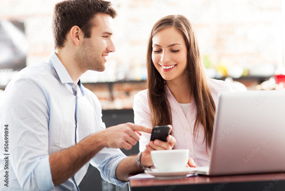 Young business people using laptop at cafe