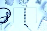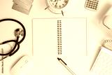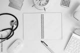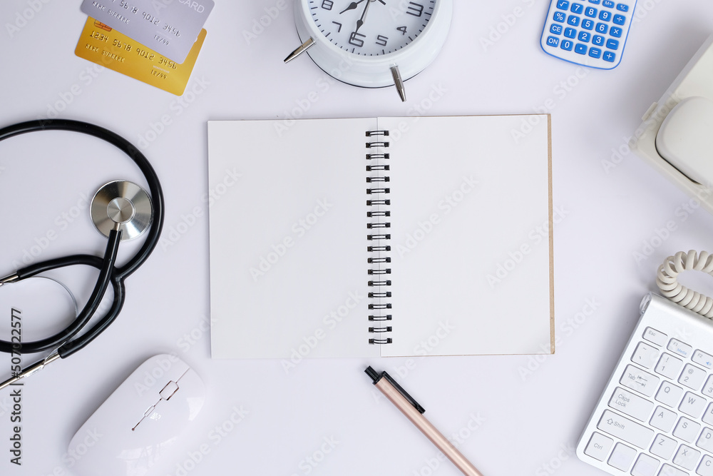 Mockup of a workspace desk in a flat lay top view. Image of a workspace with a laptop, smartphone, coffee, and notebook on background, desk concept.