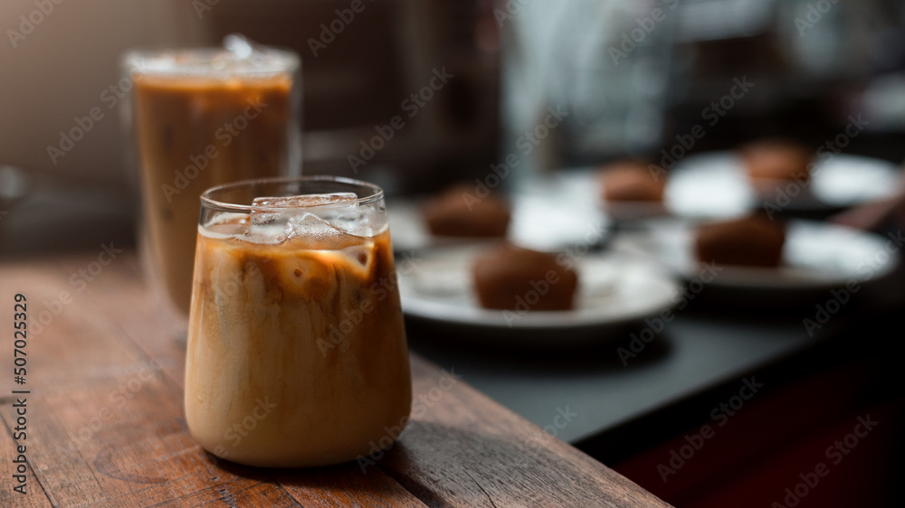 Ice coffee on a table with cream being poured into it showing the texture and refreshing look of the drink