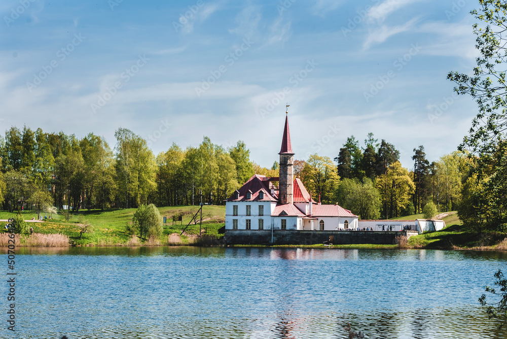 Priory Castle in Gatchina view from the lake. Russia, Gatchina.
