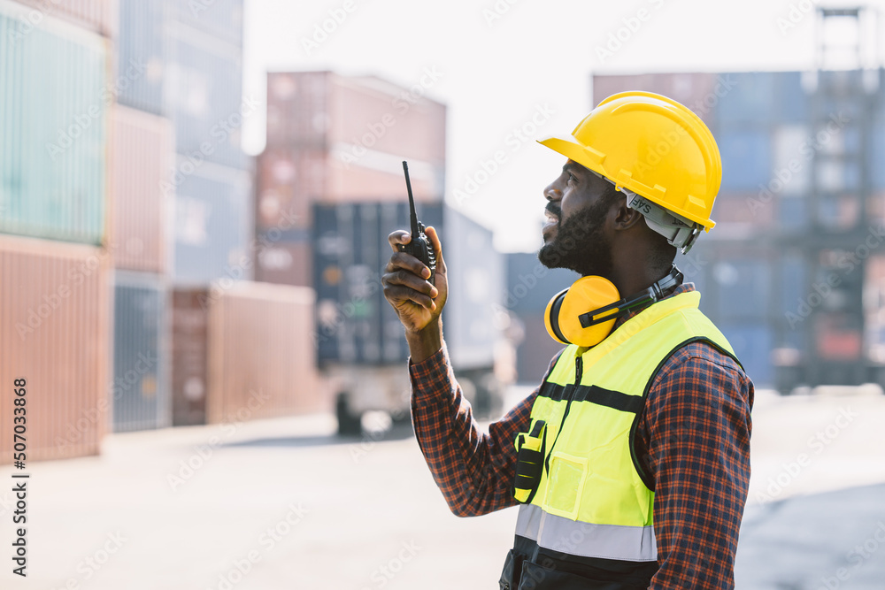 black worker African working engineer foreman radio control in port cargo shipping customs container yard