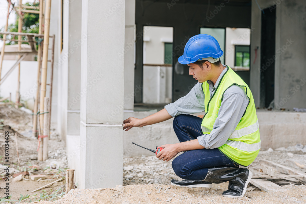engineer foreman working checking detail of home building pillars build quality at construction site