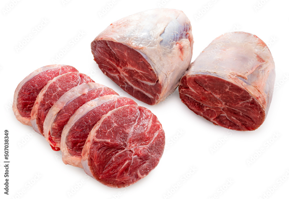 Raw Silver shank meat with Sliced isolated on white background, Shank beef on white background With clipping path.
