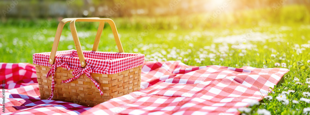 Picnic duvet with empty bascket on the meadow in nature.