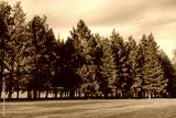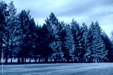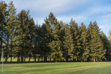 larch trees on green lawn and sunny summer day with blue sky. Outdoor exploration