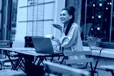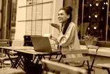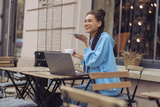 Pretty cheerful woman sending voice message and having coffee at cafe terrace. Audio chat. Outside.