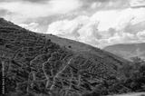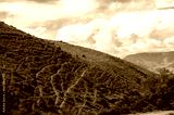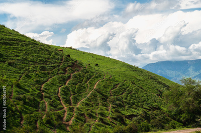 Green hillside with grazing domestic animals.