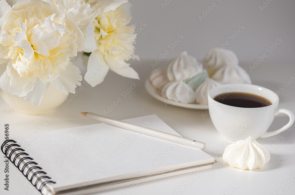 Open white notepad, cup of coffee, sweets and a bouquet of peonies on a white table. Freelancer or blogger workplace concept.