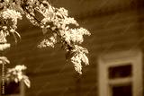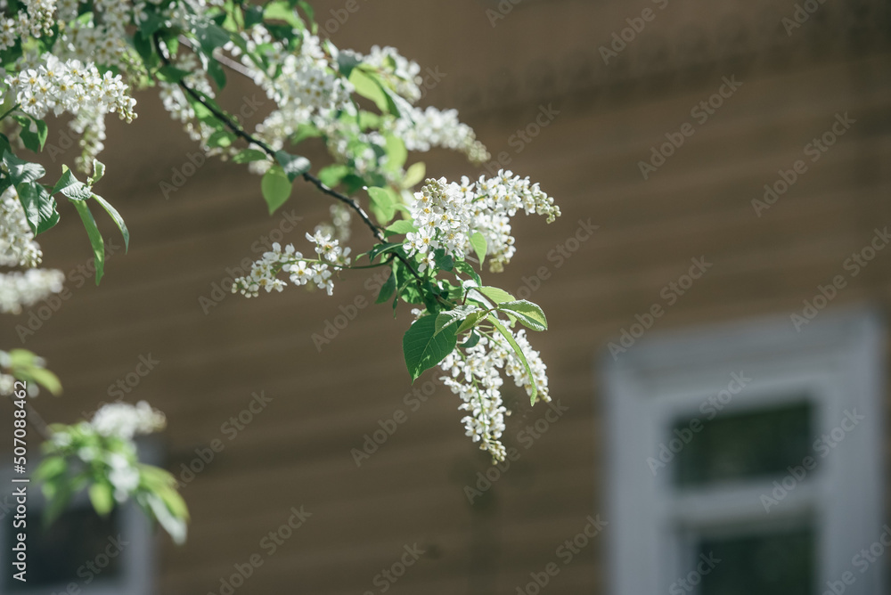 A branch of a flowering cherry tree on the background of a village house