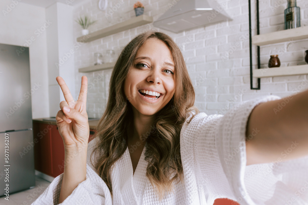 A young beautiful caucasian smiling blonde woman in a white robe takes a selfie showing a peace gesture with her v-shaped hand in the morning on background of the kitchen