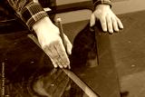 cutting glass, Glazier manually cuts the glass to size using specialized tools