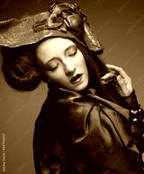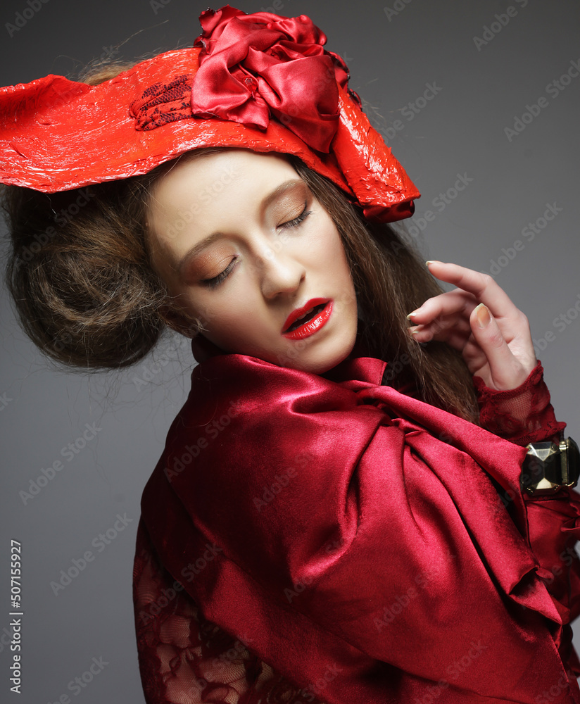 Young beautiful woman in a red lace suit and hat.