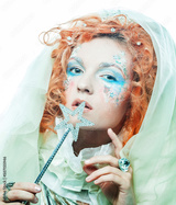 A charming woman in a New Year's costume of a fabulous fairy holds a magic wand.