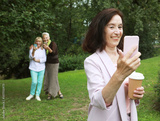 An elderly brunette lady takes a selfie, in the background her female friends also use smartphones.