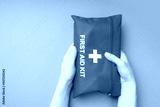 First Aid Kit in female hands on a blue background with copy space.