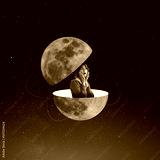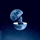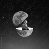 Contemporary art collage. Shocked young woman sticks out from split planet isolated on dark starry background. Monochrome. Minimalism