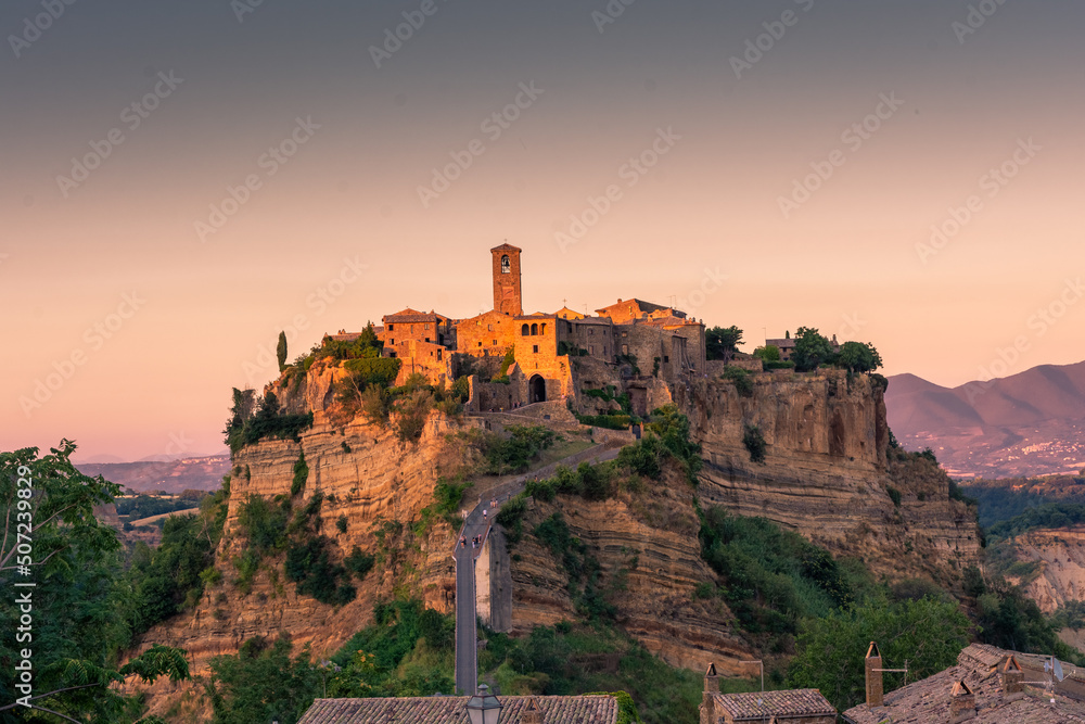 CIVITA DI BAGNOREGIO, ITALY, 7 AUGUST 2021 Beautiful view of the ghost town at sunset