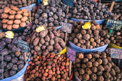Different types of potatoes at the local market in Arequipa city, Peru, South America.