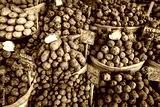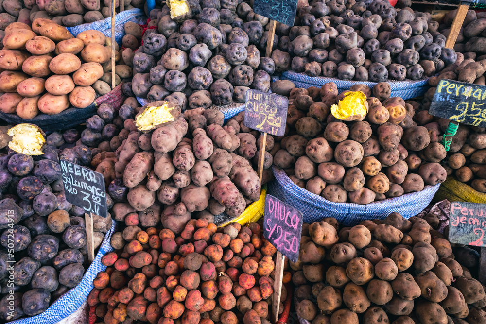 Different types of potatoes at the local market in Arequipa city, Peru, South America.