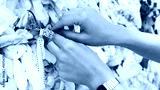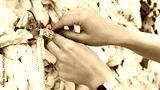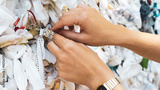 Woman's hand close-up tying the rag with a paper on which she wrote her hopes and wishes (money, love, wealth, getting well, health, luck, happiness texts) for the future to the rope.