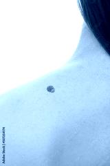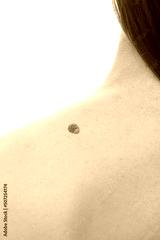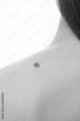 large nevus wart on young female shoulder, woman visiting doctor dermatologist, concept of benign neoplasms on human skin, regular examination and treatment.