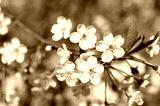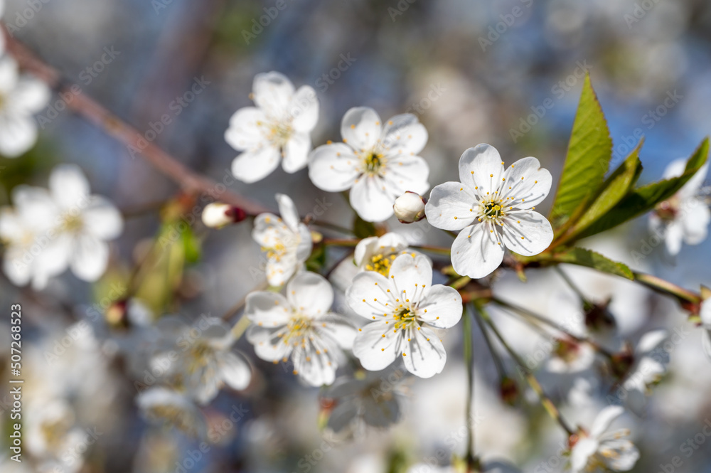 Spring Blooming. Spring blossom background. Beautiful nature scene with blooming tree and sun flare. Abstract blurred background. Springtime