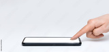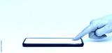 woman tapping on phone blank white screen. Smart phone on white table and female hand with finger on blank touchscreen. Woman finger presses on screen