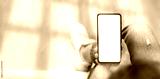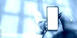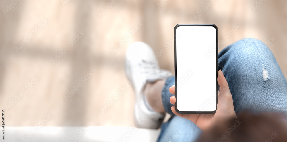 Top view mockup image of woman holding mobile phone with blank white screen. woman using cellphone with while sitting cross-legged on sofa at home. Mockup smartphone. wide image banner