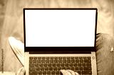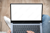 Top view mockup image of woman working and typing on laptop computer with blank screen while sitting on a sofa at home