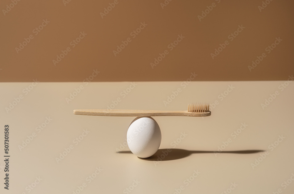 Organic wooden bamboo toothbrush and white egg composition on terracotta and beige background. Natural beauty and health concept. Eco-friendly zero waste design with copy space.