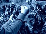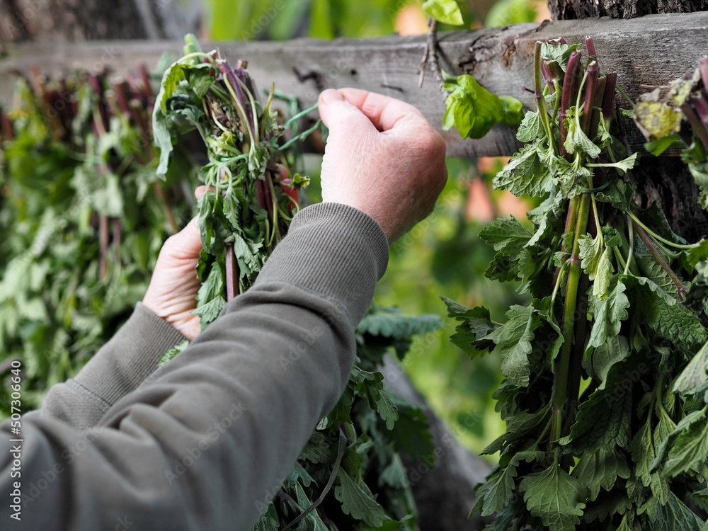 An elderly woman dries the beneficial plants of lemon balm for tea and use for treatment.