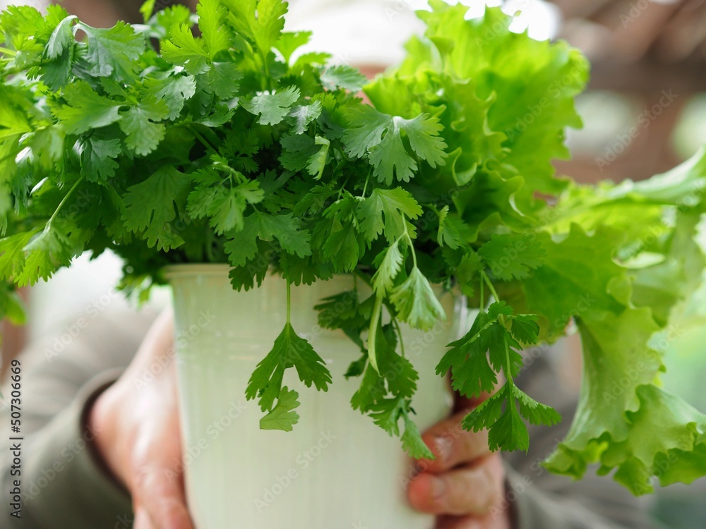 An elderly woman holds a bunch of healthy cilantro herb grown in her own garden in her hands. Natural seasoning.