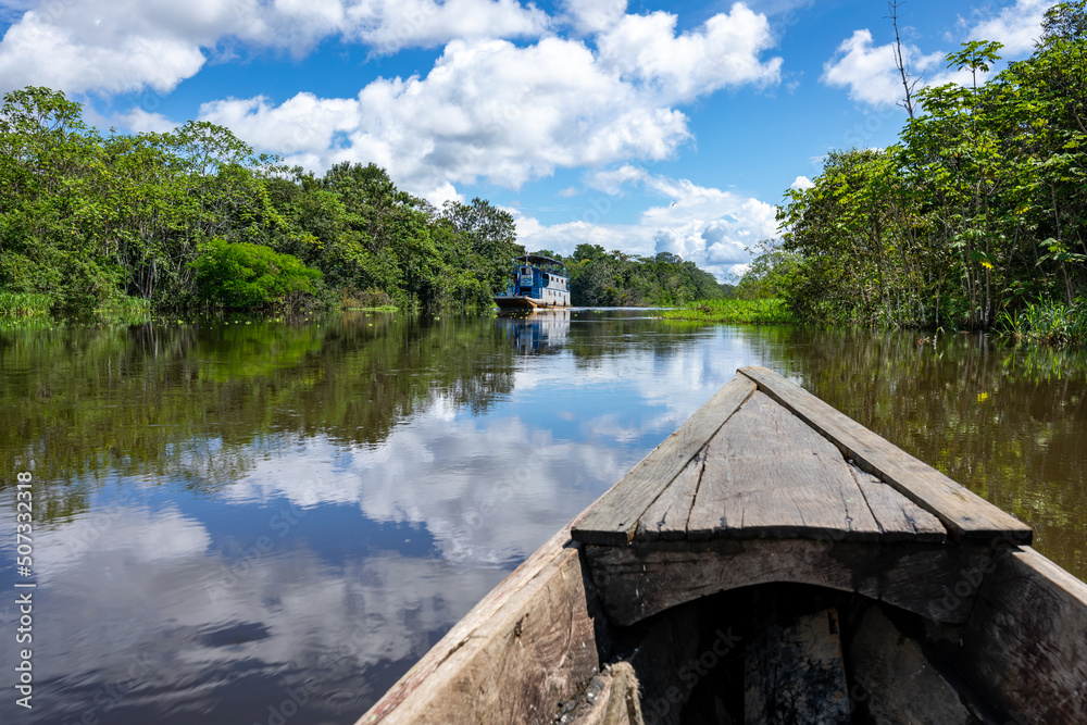 Amazon Rainforest Riverbank. Sailing down river Yanayacu at the Amazon jungle, near Iquitos, Peru. South America.