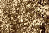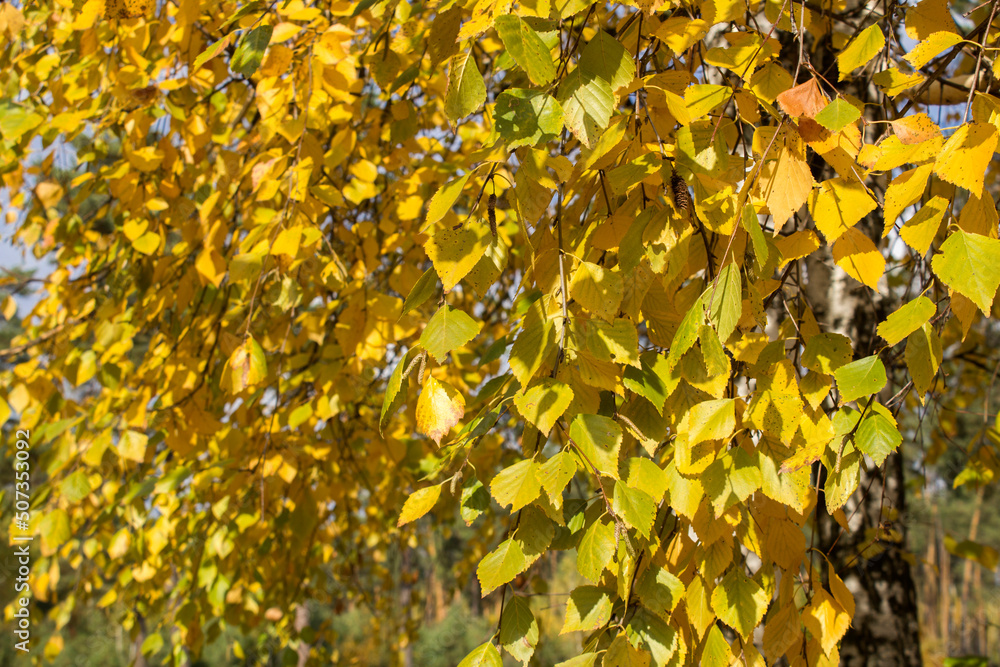 Close-up on birch branches with yellow leaves in the forest. Natural autumn background.
