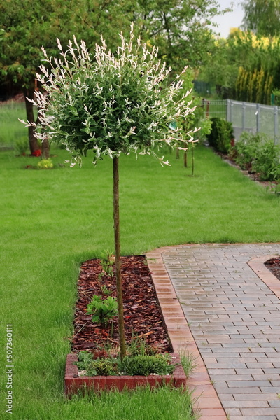 Japanese willow grows next to a garden walkway and a flower bed covered with bark.